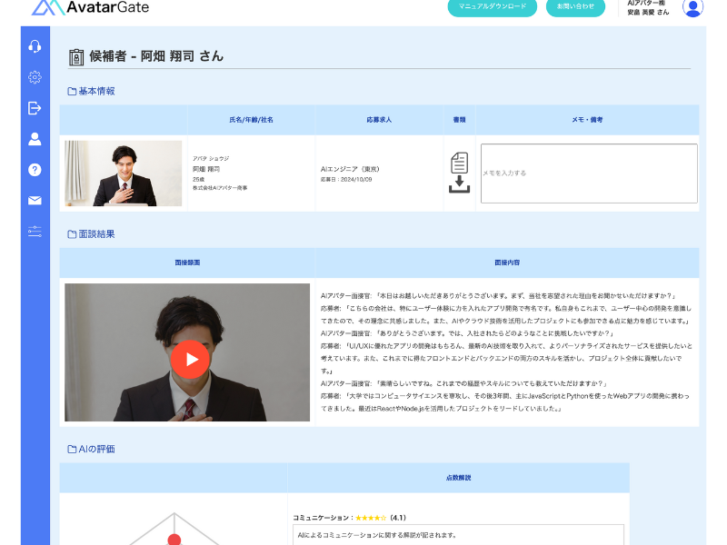 解決策:AIアバター面接官を活用することで、エンジニア候補者に対して技術スキルや問題解決能力を問う標準化された質問を行い、その結果をAIが自動でスコアリング。